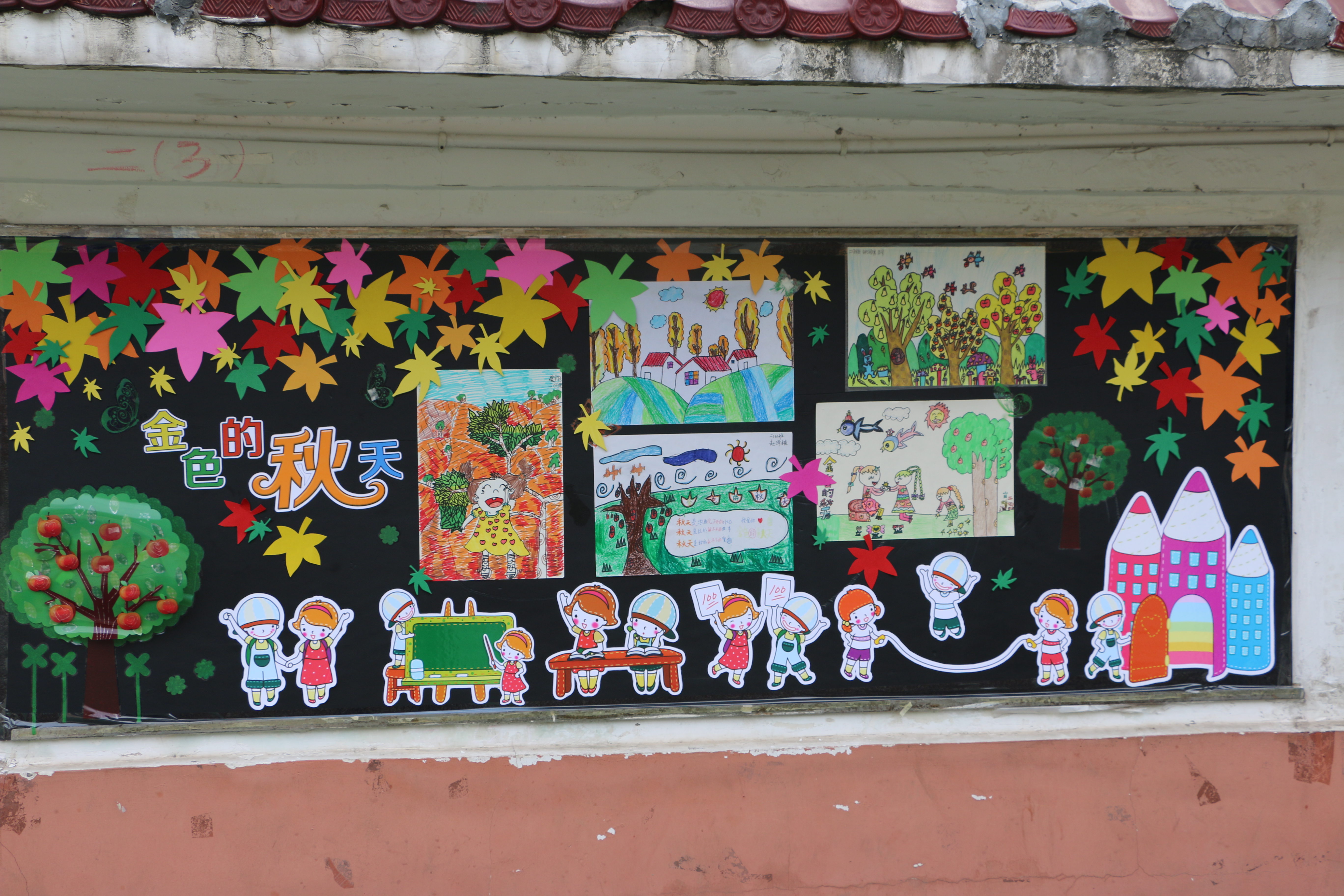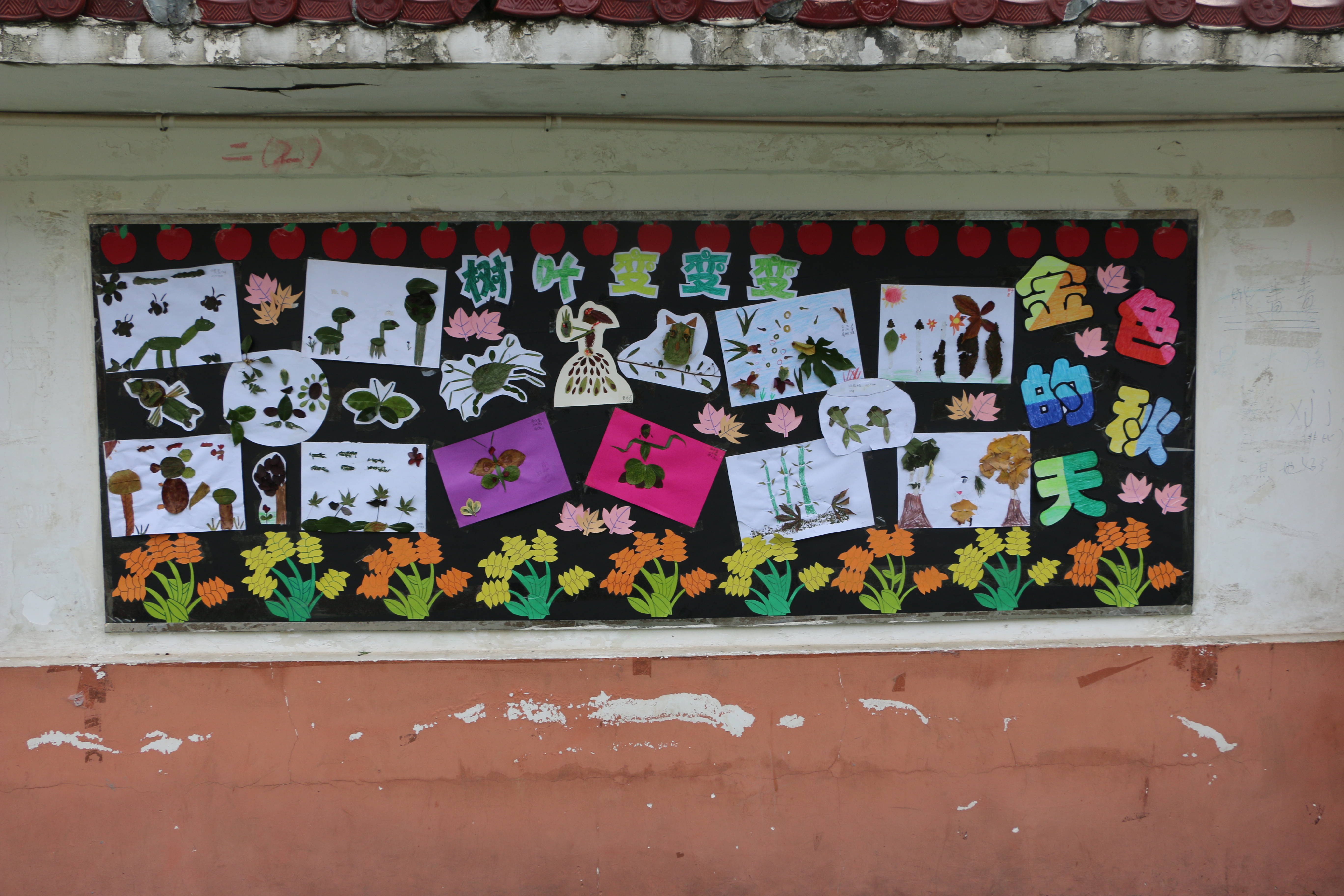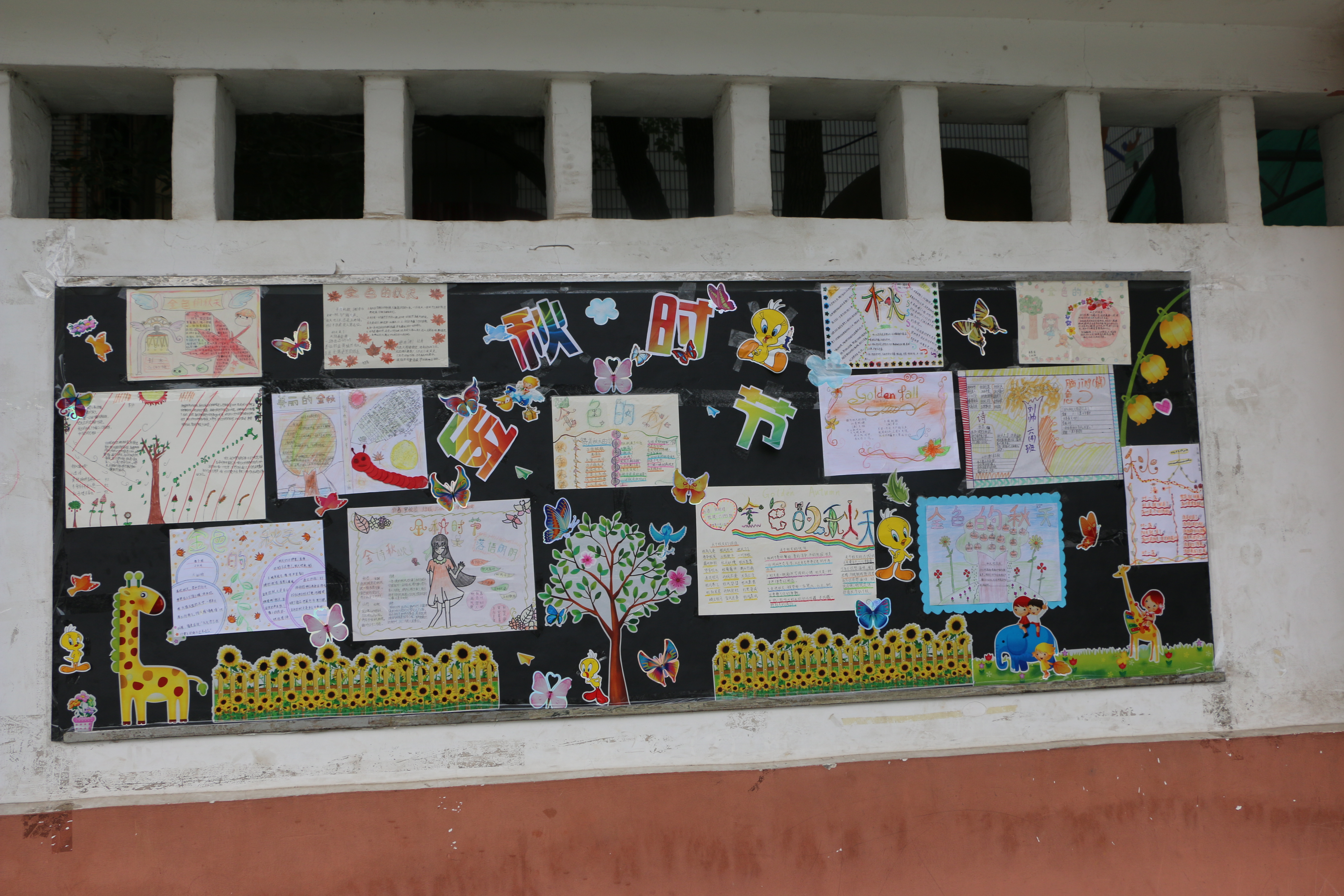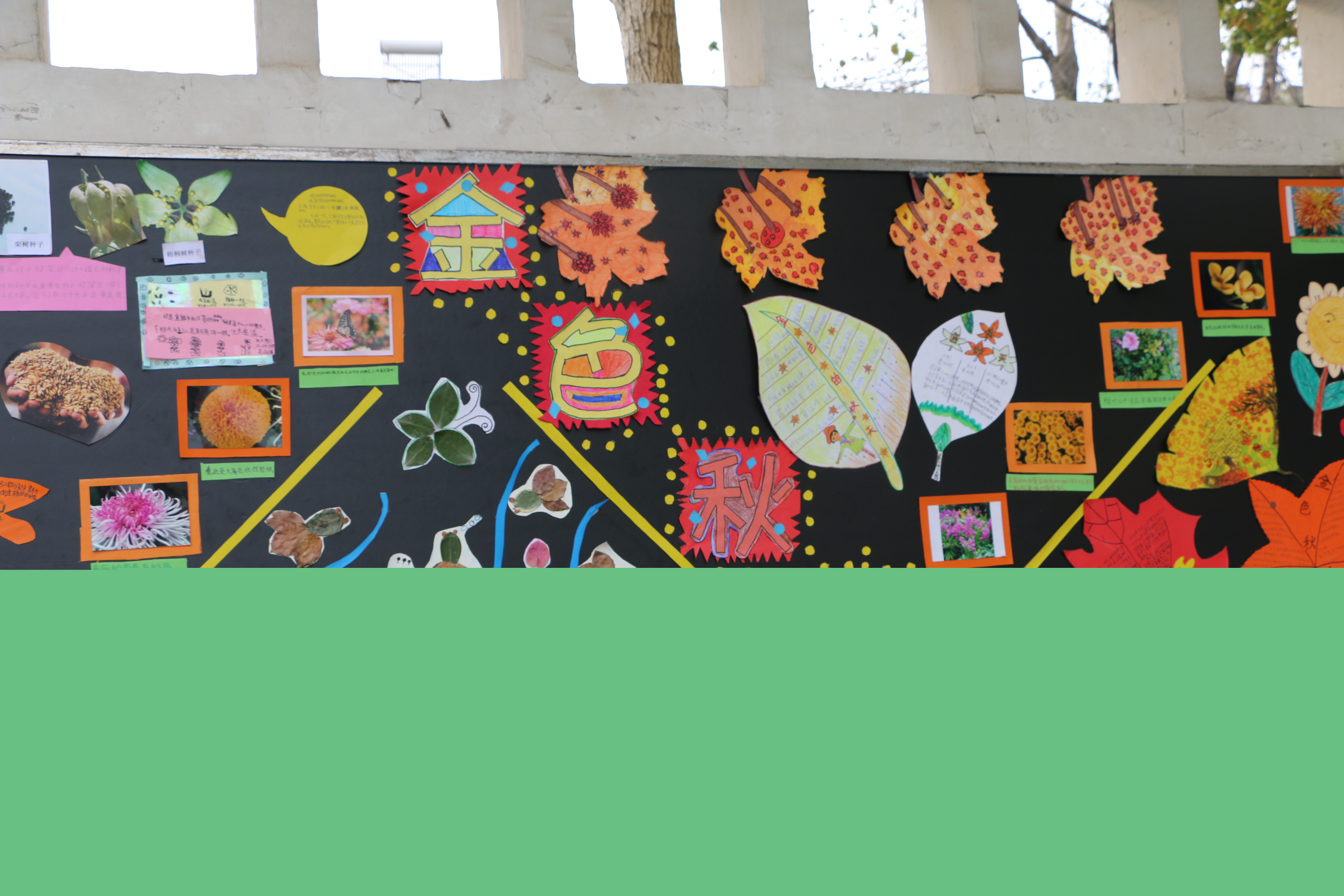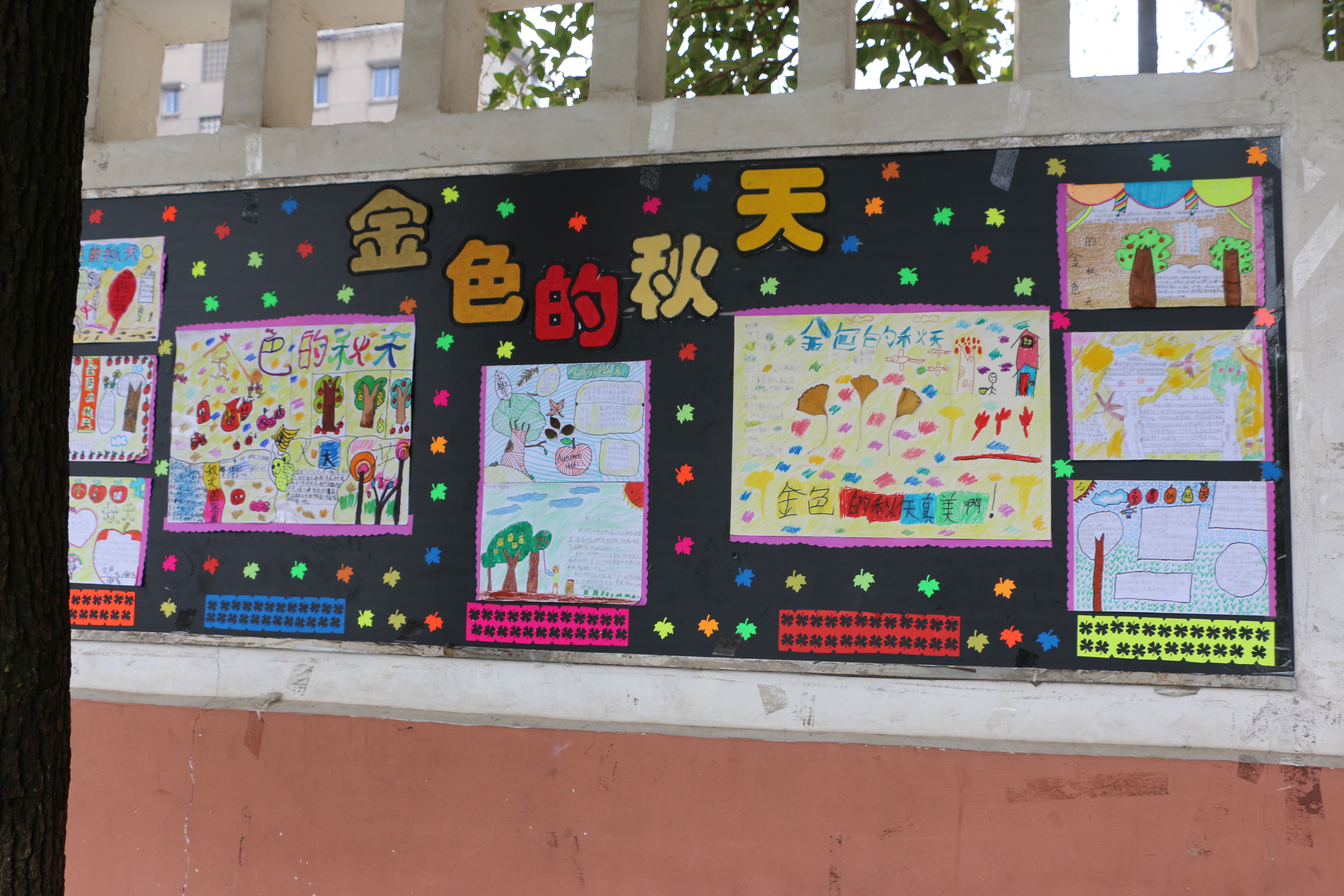 天高高的,云淡淡的,一棵棵大树脱下绿色的衣裳,换上了黄色的新装。秋风吹过,一片片落叶飘下,像蝴蝶起舞,像仙女散花。小喜鹊衔来树枝造房子,小松鼠找来松果当粮食,小青蛙在加紧挖洞,准备舒舒服服地睡大觉呢。小朋友们拾来了秋叶,拼成了有趣的图案;一群大孩子拿起画笔,记录下小动物们的活动,写出了优美的文章。瞧!下面就是他们精彩的作品: