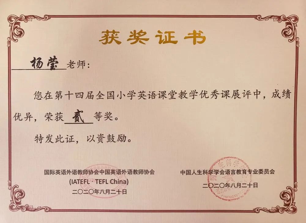 热烈祝贺黄色直播 杨莹老师在第十四届全国小学英语教师教学基本功大赛中荣获“小学英语课堂教学优秀课展评二等奖”。