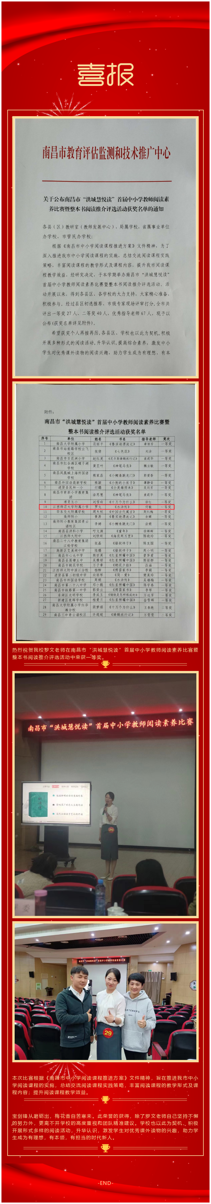 喜报〡热烈祝贺黄色直播 教师在南昌市“洪城慧悦读”首届中小学教师阅读素养比赛暨整本书阅读推介评选活动中荣获一等奖