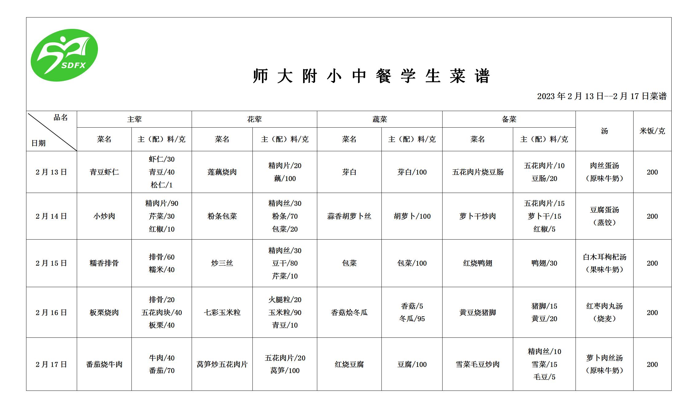 师大附小2023年2月13日-2月17日食谱