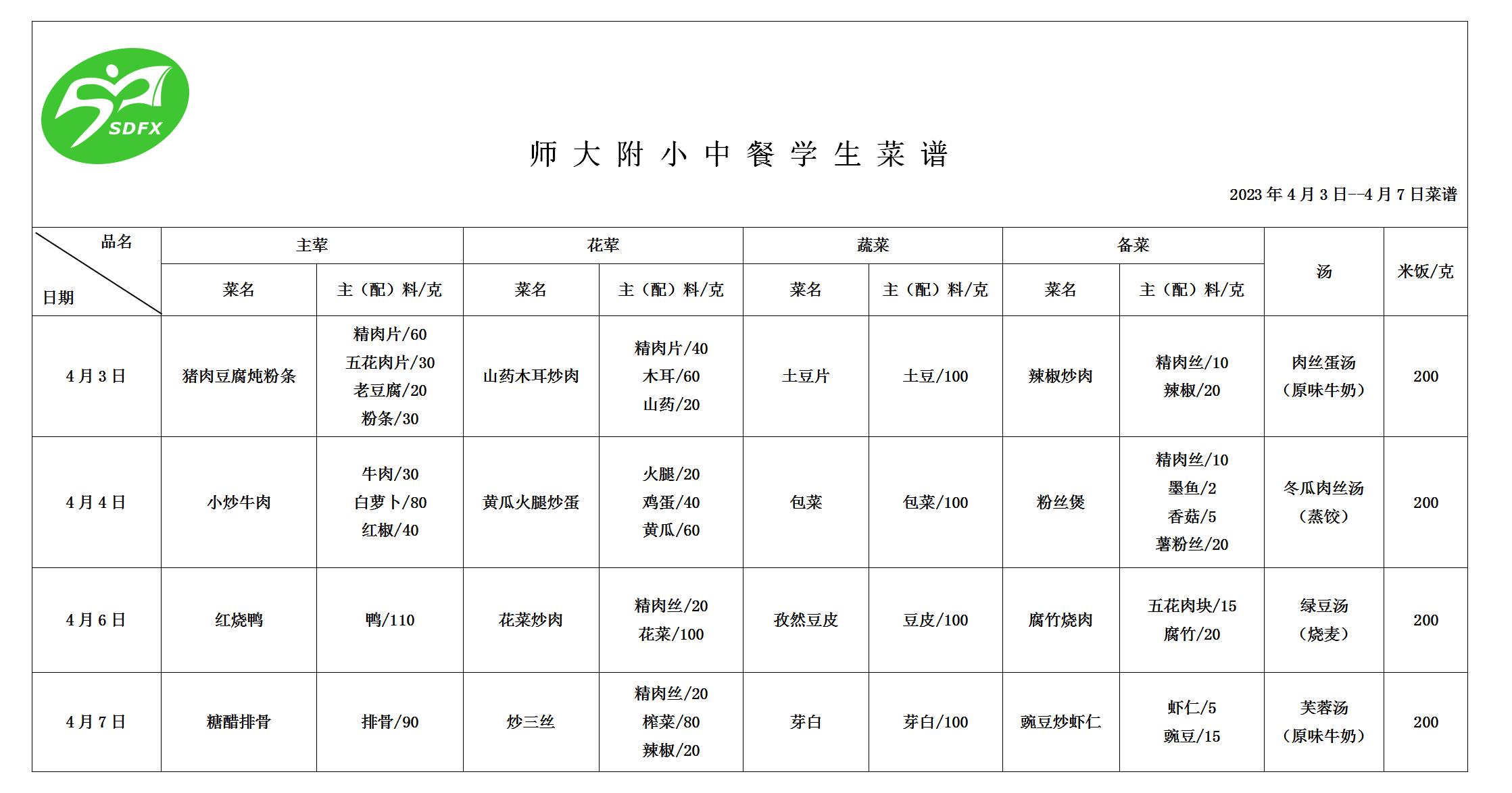 师大附小2023年4月3日-4月7日食谱