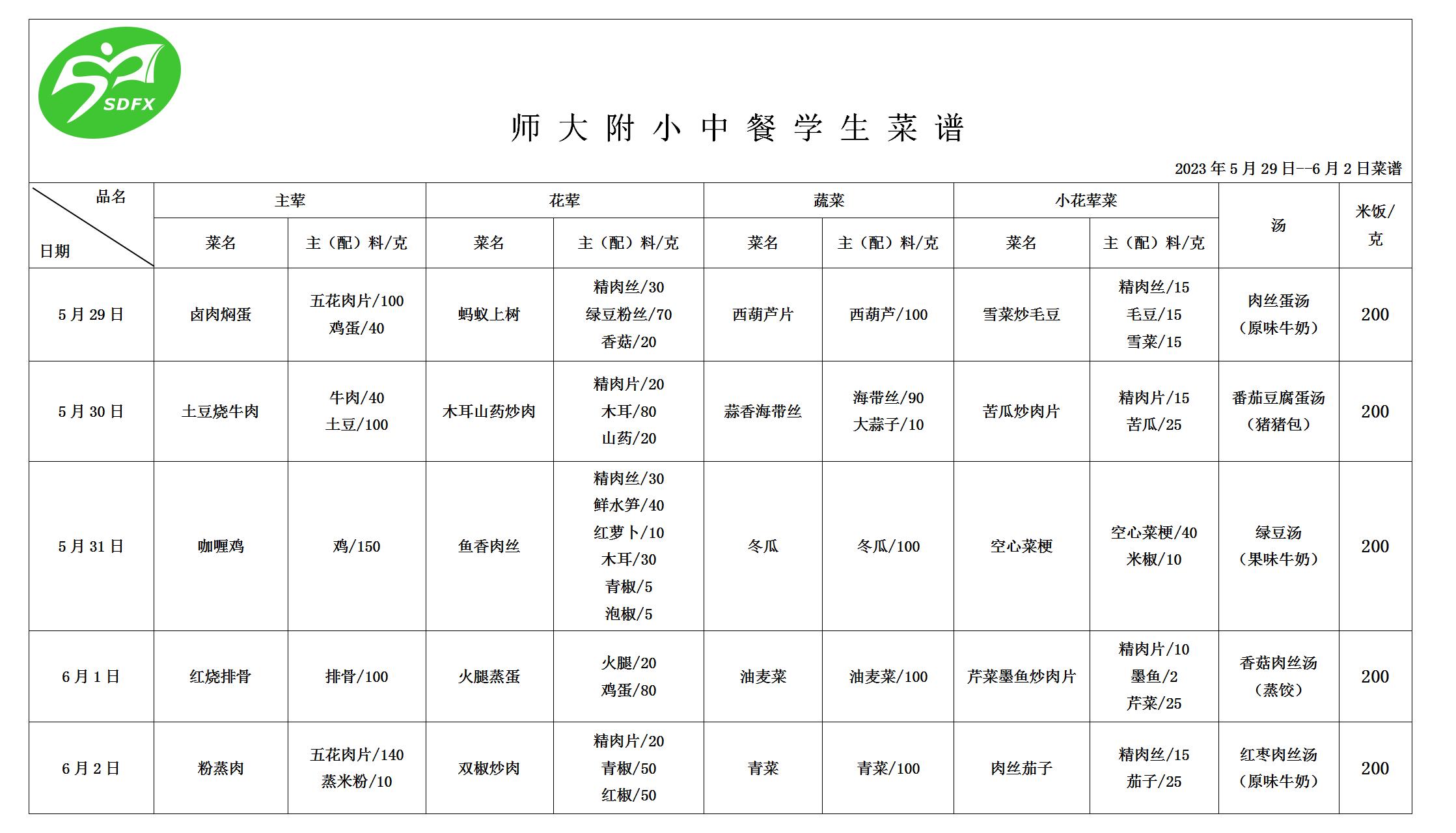 师大附小2023年5月29日-6月2日食谱