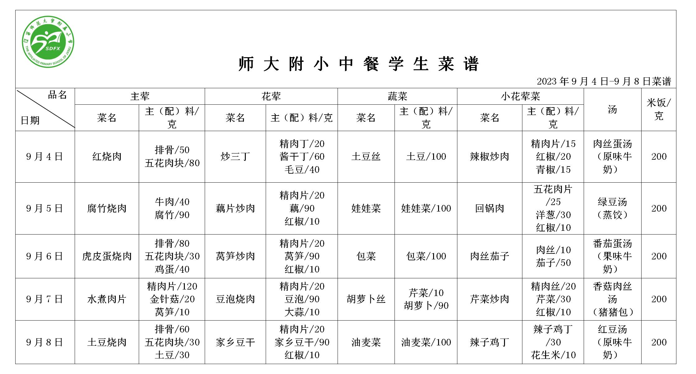 江西师大附小2023年9月4日-9月8日食谱
