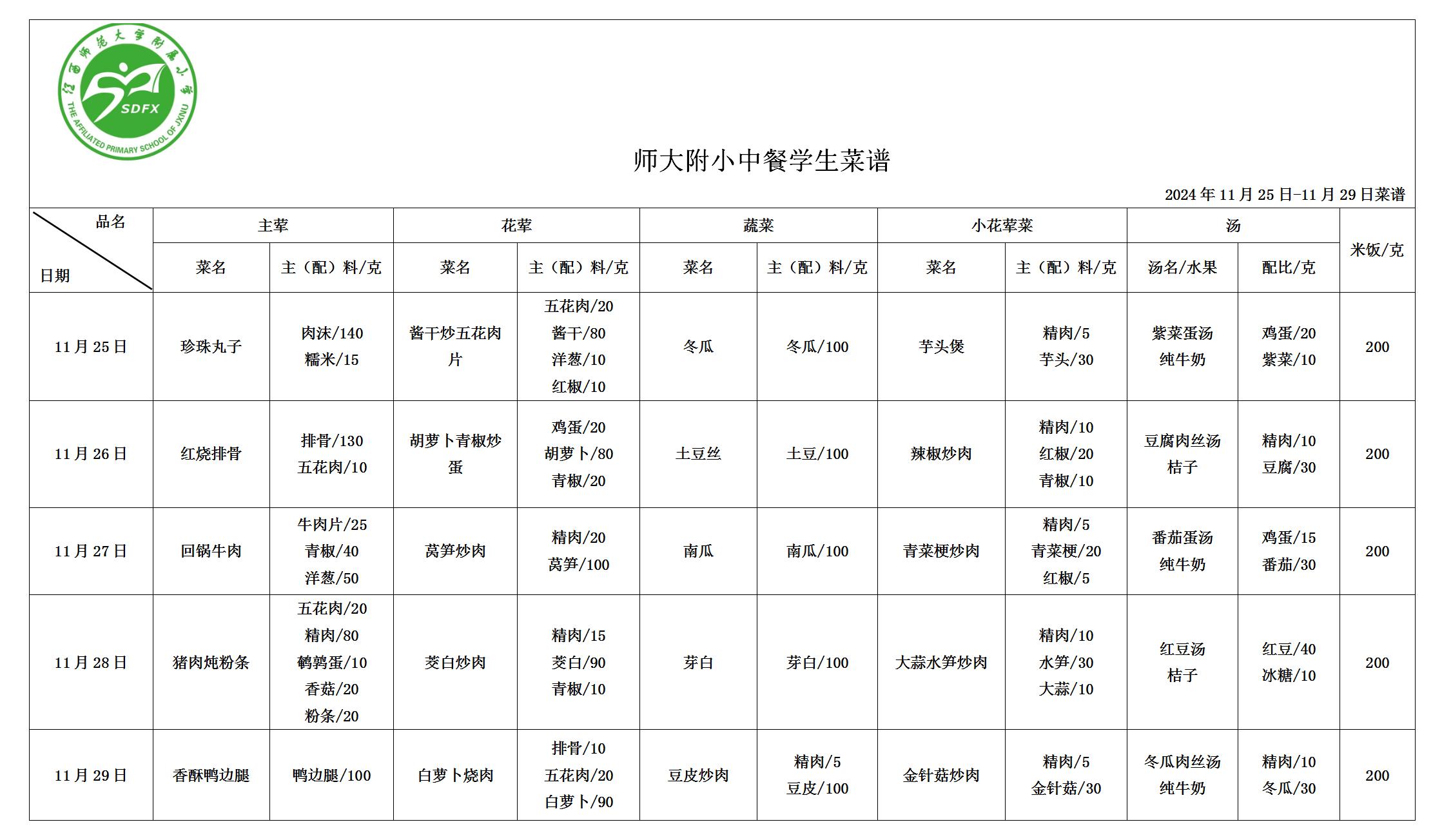 师大附小2024年11月25日-11月29日食谱