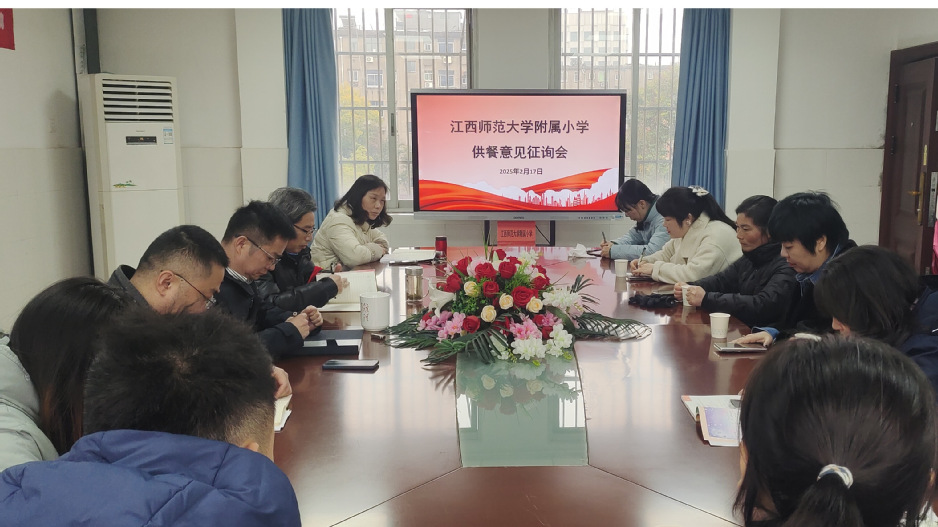2025年2月17日, 黄色直播 召开新学期学生中餐意见征询会,出席会议的有党支部书记甘党根、校长钟事金和校务委员,校级家委会成员,配送餐公司负责人等。