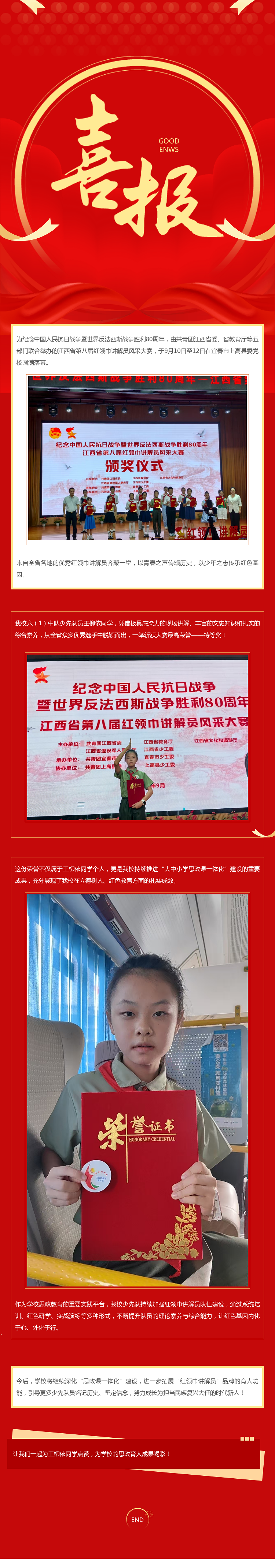 喜报|热烈祝贺黄色直播 少先队员王柳依在全省红领巾讲解员大赛中荣获特等奖!